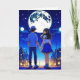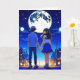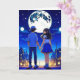 Cute ai generated art with a couple holding hands looking out at the full moon and city lights. Romantic flirty birthday card.