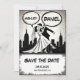 This elegant black-and-white comic book-style wedding save the date card is perfect for a modern wedding. The simple design features elegant black calligraphy and a bride and groom illustration on a comic book-themed background.
