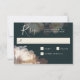 A uniquely elegant wedding RSVP card design with subtle light and shadows and beautiful floral elements that include double tulips, white berries, and Icelandic poppies. The colour scheme includes off-white flowers with slight tinges of pale blush and a luxurious deep slate grey background. Personalise the text template with your required response date.