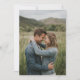 This invitation features a romantic and serene design, capturing a couple embracing in an outdoor setting surrounded by tall grass and distant hills. The color palette is dominated by medium blue denim tones, complemented by soft earthy hues from the natural landscape. The photograph emphasizes realistic representation with gentle lighting that enhances the intimate mood of the scene. Perfect for weddings or engagements, this design focuses on natural beauty and emotional connection, making it ideal for those seeking a heartfelt and tranquil aesthetic.