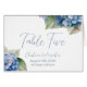 These romantic floral wedding table cards feature watercolor blue hydrangeas. A delicate bouquet of hydrangea flowers is pictured on the top, and another on the bottom left. The table number is printed in an elegant font in the centre, followed by the names of the couple and wedding date.