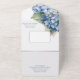 This romantic floral wedding invitation features watercolor blue hydrangeas. A delicate bouquet of hydrangea flowers is pictured on the front flap, and two on the inside portion.