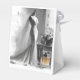 Elegant and delicate, this romantic wedding favour box features a fine pencil sketch of a bridal gown on a mannequin, a floral bouquet resting on the floor, and a vintage-style perfume bottle in soft pink hues — the only touch of colour in this black and white scene. A refined and timeless detail to present sweets, macarons, or personalised gifts at your wedding reception.