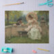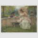 This design features a painting by the Italian artist Federico Andreotti (1847–1930). It shows an elegant young woman sitting on a stone bench in a parkland. She is talking to her male suitor, who is crouching down beside her. The two lovers are having a romantic conversation away from the prying eyes of family and friends. The lady is wearing a fashionable white dress, and she is holding a parasol to protect herself from the sun. The gentleman is also wearing a historical costume appropriate to the era. On the bench next to the young woman is a book, perhaps containing love poetry, and some pink roses, which may have been given as a given by her admirer. The couple are surrounded by beautiful verdant trees. There is also a lake or river running through the park.