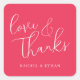 This wedding sticker features a simple yet elegant design with a vibrant coral pink background and crisp white cursive text that reads "love & Thanks," creating an intimate and affectionate feel. The layout is balanced, with ample negative space around the flowing script, which contrasts beautifully with the smaller, clean sans-serif font below for customizable names. The modern and minimalistic style emphasizes elegance through simplicity, making it perfect for expressing heartfelt gratitude at weddings or other special occasions. Its warm and romantic tone ensures it stands out as a thoughtful and visually appealing addition to any celebration.