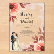 This elegant watercolor floral wedding acrylic invitation is perfect for a modern wedding. The romantic design features a sleek watercolor floral frame with a bride and groom illustration and black calligraphy on a white background.