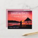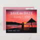 A "save the date" postcard with a loving couple on the beach at sundown.