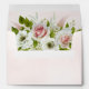 Elegant wedding envelopes invitation design featuring pink and white watercolor flowers and green foliage on a light pink background. Envelope flap is customisable with return address.