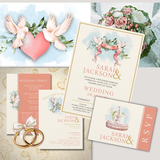 Utilise this beautiful wedding sticker on invites, thank you cards, favours, and more! Beautiful wedding doves with coral-coloured accents where text is easily updated prior to placing into your shopping cart.