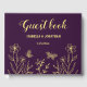 Unique simple wedding guest book featuring romantic and elegant gold flowers and butterflies on purple background