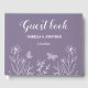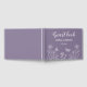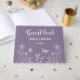 Unique simple wedding guest book featuring romantic and elegant white flowers and butterflies on mauve background