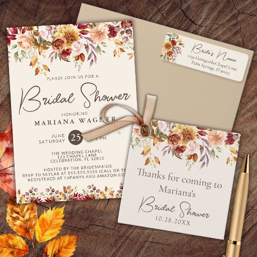 Romantic fall floral bridal shower invitation for a elegant bridal shower invitation with autumn flowers on ivory.