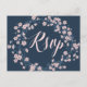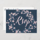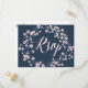 Romantic floral wedding RSVP postcards with beautiful pink wreath and customisable text, printed on blue background