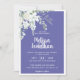 Create the perfect Wedding suite with this romantic and beautiful wedding invitation featuring a delicate watercolor bouquet with white gentle flowers, complemented with greenery and other botanical foliage on the left top corner, over a classy contemporary plain periwinkle purple background. Easily edit the template fields to add the bride and groom names in a classy white font, and your date and location details in a modern all-caps font.