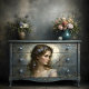Turn furniture into museum-quality art with this romantic floral portrait from Découpage Boutique. Featuring a softly painted woman adorned with delicate blossoms and framed by graceful botanical details, this artwork evokes serenity, femininity, and timeless beauty.