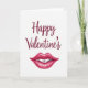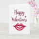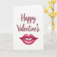This design shows a white background with “Happy Valentine’s” written across the upper half in flowing sangria-red lettering that feels like a cozy note passed between sweethearts 🥰. The letters have thick-and-thin strokes and a slightly brushed look, giving the words a soft, romantic movement as they stretch from left toward the center. Below the text, a large pair of glossy fuchsia lips sits as the main image, shining with bright highlights that suggest fresh lip gloss and an almost kiss-ready pose ❤️. The lips are slightly parted, and a small sliver of white teeth shows through, like a teasing smile shared up close. Subtle ridges and shading along the curves add depth, making the mouth look plush and touchable against the plain backdrop. The strong contrast between the deep red text and the smooth pink lips keeps the layout simple while still feeling flirty and intimate. The sangria-red phrase sits above the centered lips, with the fuchsia gloss reflecting light in tiny bright streaks along the top lip and lower curve.