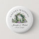 This romantic garden wedding button design features a floral wedding arch and a fountain with a customisable grey typography on a white background.