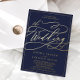 This romantic gold foil navy blue frame wedding invitation is perfect for a simple wedding. The modern classic design features fancy swirls and whimsical flourishes with gorgeous elegant hand lettered gold foil stamped typography and a formal foil frame on a dark blue background.