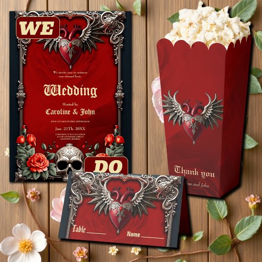 Romantic Gothic icon: heart, rose, skull. RSVP Card
