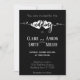 Two white hearts with the text 'wedding' cut out on a black background. Making a crisp and modern yet romantic invitation. On the other side is a matching design with hearts and dots.