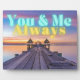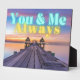Romantic and modern tabletop sign features photograph of tropical island boat dock at sunset with neon aqua and gold text that reads "You and Me Always"