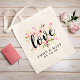 "Love" in playful black script sits atop a beautiful arrangement of pink watercolor blooms and lush greenery with personalized couple names and wedding date curving below. A charming design that works as a wedding welcome bag, bridal party favor, or keepsake for the newlyweds. All text including names and date are fully customizable.