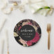 Romantic vintage look moody floral wedding paper plate features a beautiful flower and greenery pattern on a dramatic black background, and includes welcome script with names and date.