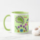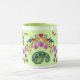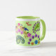 This mug has a vector illustration design with cute love birds, retro flowers and Paisley shapes / leaves in bright colours. The text on the left and on the right side are template objects and can be changed easily into any other text.
