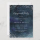 Elegant and romantic galaxy theme engagement party invitation template card. Background is dark navy blue watercolor with faux silver glitters on the top and bottom. The design resembles stars in a night sky. The card is easily customisable online.