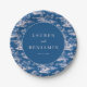 This elegant wedding plate features a serene pastoral scene with trees, bridges, and small buildings set against a deep navy blue background. The intricate white illustrations create a continuous landscape, while the central circular element highlights customizable text in a classic serif font. The monochromatic color palette of blue and white exudes sophistication and tranquility, making it perfect for formal celebrations. Ideal for weddings or romantic events, this design combines tradition with a touch of idyllic charm.