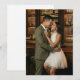 This wedding invitation features a romantic and intimate design with two individuals in an affectionate pose, set against the backdrop of a stylish bar. The warm colour palette includes earthy browns from the wooden shelves and soft olive green from one individual's suit, contrasted by the brightness of a white dress. The photographic art technique captures a realistic and tender moment, emphasizing natural expressions and textures. The overall mood is joyful and loving, perfect for celebrating a special occasion.