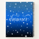 Add creative vibes to your musings with this journal, which features a myriad of stars, near and far, twinkling against a midnight blue sky background transitioning to black, with the word "dreamer", set in elegant flowing script. Personalise as desired.