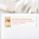 This return address label features a romantic and vintage-inspired design with a soft pastel floral pattern on the left, showcasing hues of orange, yellow, green, and beige in a watercolor style. The right side presents elegant, coral red serif typography that is customisable for names, addresses, locations, and dates, offering a personal touch to your correspondence. The balanced composition combines delicate florals with clean text, creating an atmosphere of warmth and nostalgia, perfect for adding charm to wedding invitations or special occasion mailings.