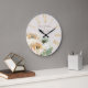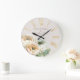 This romantic floral wall clock features an elegant ivory colour background with watercolor ranunculus flowers. A delicate bouquet of peach and white coloured ranunculus is pictured on the bottom. The names of a sample newlywed couple and wedding date are printed above. You can personalise the clock to include your own custom names or text. The numbers are printed in a gold foil Roman numeral design.