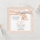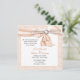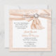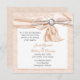 Romantic peach and white square wedding invitation, with graphics of a elegant peach damask background. A white text area is topped, with a peach satin looking bow, enhanced with pearls. Dark grey and peach coloured text is fully customisable to suit your wedding needs. The back side of the invitation is finished off in an lovely matching peach damask. Matching wedding products available.