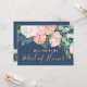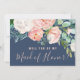 This romantic peonies blue maid of honour proposal card is perfect for an elegant wedding. The floral design features blush pink, peach and white cascading watercolor flowers on a navy blue background. Customise the card with the name of the bride and the maid of honour. Personalise the back of the card with a personalised message.