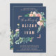 This romantic peony flowers blue the wedding of invitation card is perfect for an elegant wedding. The floral design features blush pink, peach and white watercolor flowers with faux rose gold geometric elements on a navy blue background.