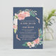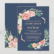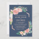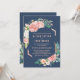 This romantic peony flowers blue wedding invitation card is perfect for an elegant wedding. The floral design features blush pink, peach and white watercolor flowers with faux rose gold geometric elements on a navy blue background.