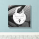 Romantic personalised love lock photo canvas print. Heart shape lock with keyhole. Black and white / sephia photograph with custom 'engraved' date and names of newly weds couple. Beautiful wedding or anniversary gift idea for newlyweds bride and groom / husband and wife. Classy photograph image with elegant script typography. Romance theme home decor. Love symbol lock on river bridge.