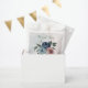 Beautiful botanical wedding favour bag featuring pink, dusty blue and navy blue flowers with green leaves.