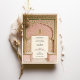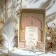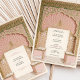This breathtaking wedding invitation features an opulent Indian-inspired arch design, intricately adorned with gold filigree, soft pink peacock feather motifs, and delicate floral embellishments. Inspired by Jaipur’s palace architecture, this design evokes a regal and romantic atmosphere, making it perfect for couples seeking a luxurious, culturally infused wedding invitation. The soft pastel hues blend seamlessly with intricate detailing, creating a timeless elegance ideal for grand celebrations and destination weddings. The refined typography complements the exquisite artwork, ensuring a truly memorable wedding stationery piece.