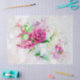 Beautiful tissue paper design featuring romantic floral composition with pink roses, greenery, bokeh and sparkles on white wooden background.