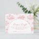 Celebrate a timeless and romantic baby shower with this elegant pink toile design, featuring delicate vintage countryside illustrations in soft blush tones. The refined arch layout creates a beautiful focal point for your event details, blending classic European charm with a modern, feminine aesthetic. Perfect for a chic, storybook-inspired celebration, this design feels both graceful and effortlessly sophisticated—ideal for creating a memorable and stylish gathering.