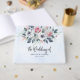 Elegant wedding guest book featuring pink and white watercolor flowers bouquet on a light blue background.