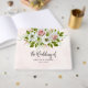 Elegant wedding guest book featuring pink and white watercolor flowers bouquet and green leaves on a light pink background.