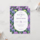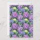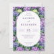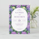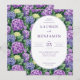 This elegant wedding invitation features a lush floral design with hydrangeas in shades of purple, blue, and green, creating a romantic garden atmosphere. The central oval frame highlights the event details in a classic serif font, offering a formal yet inviting look. Perfect for couples seeking a sophisticated touch, this design combines rich colours and detailed illustrations to set the tone for a memorable celebration.