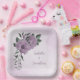 Unique wedding paper plate featuring romantic dusty purple flowers and green leaves.