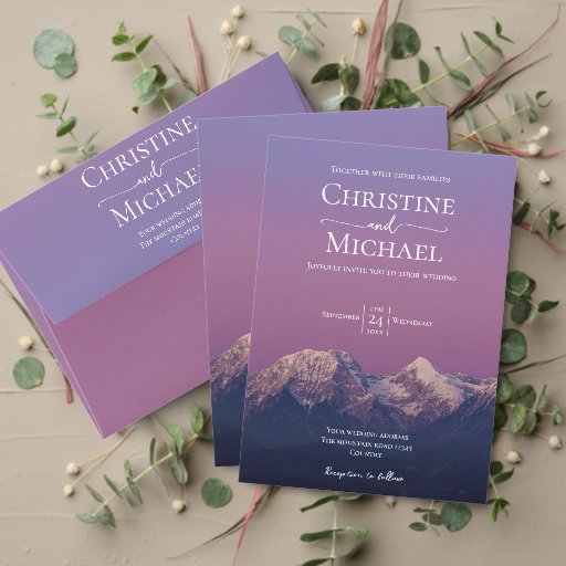 Romantic purple sunset snowy mountains wedding. Romantic wedding design with a landscape photograph of snow covered rocky mountains. The mountains are just barely touched by the soft orange glow of the setting sun. The sky above the majestic mountain range is coloured in such stunning natural hues of pink and purple. A light and aery gradient of colours slowly turning from purple to deep indigo and blue. All information on the product is fully customisable by clicking "Personalise this template". If you want to change the size of font or move some things around you can achieve that by clicking "Edit using design tool".