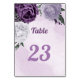 Beautiful botanical table number card featuring romantic purple lavender and white flowers with green leaves
