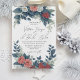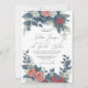 Our Winter Floral Wedding Invitation showcases a harmonious blend of winter flowers and leaves, elegantly rendered in rich red, pink, and white hues, set against a backdrop of deep blue foliage. This captivating contrast evokes the allure of a winter wonderland.